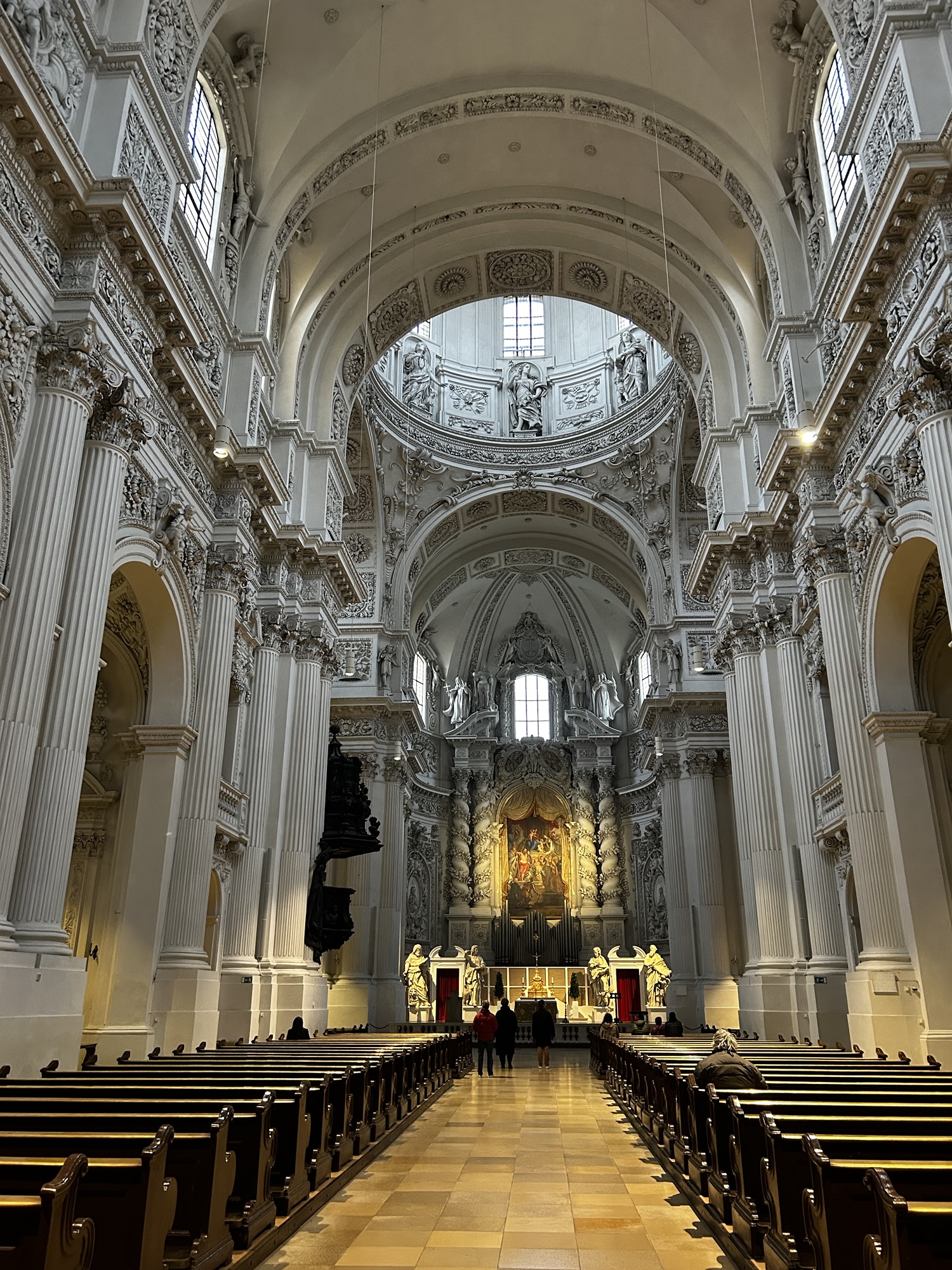 The Theatinerkirche is another must-see church in Munich. Its bright yellow exterior is hard to miss, but it’s the inside that truly takes your breath away. The towering white ceilings, intricate columns, and stunning altar is something everyone should experience. Whether you’re seeking out beautiful architecture or just stepping out of the rainy Munich weather (like we were), we highly recommend checking this church out.
